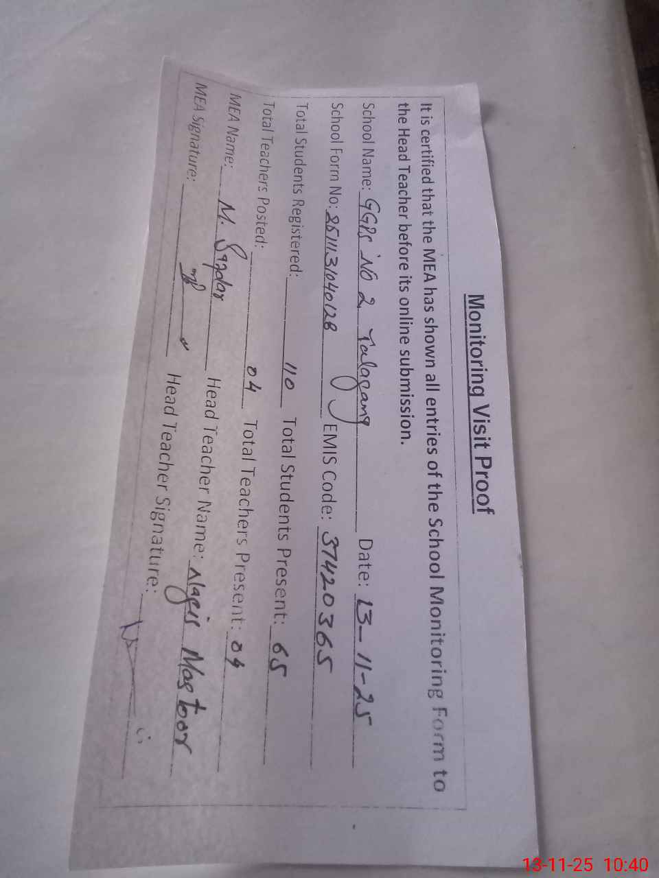 | Attendance Register | Head Teacher | MEA with School | Visit Proof |