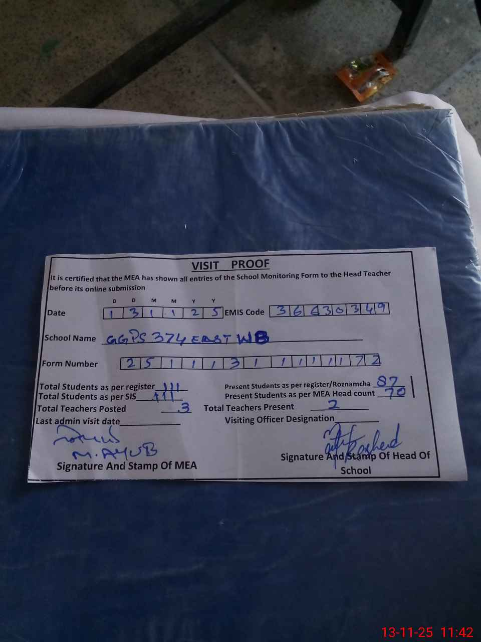 | Attendance Register | Head Teacher | MEA with School | Visit Proof |
