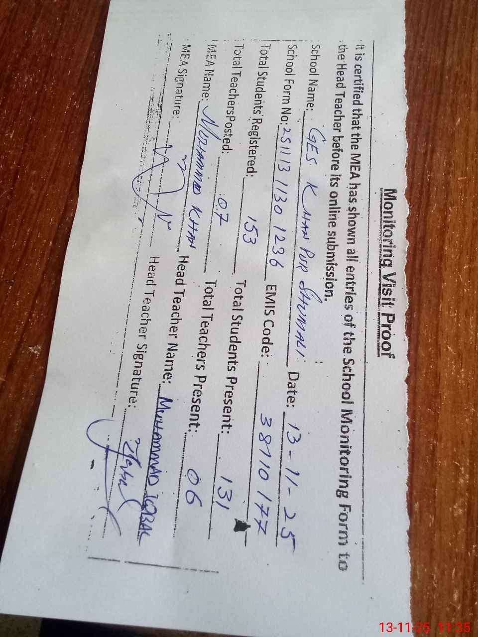 | Attendance Register | Head Teacher | MEA with School | Visit Proof |