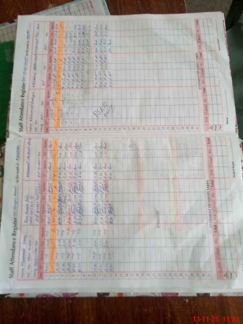 | CNIC | Full Name | Designation | R/C | Absence During Last Calender Month |