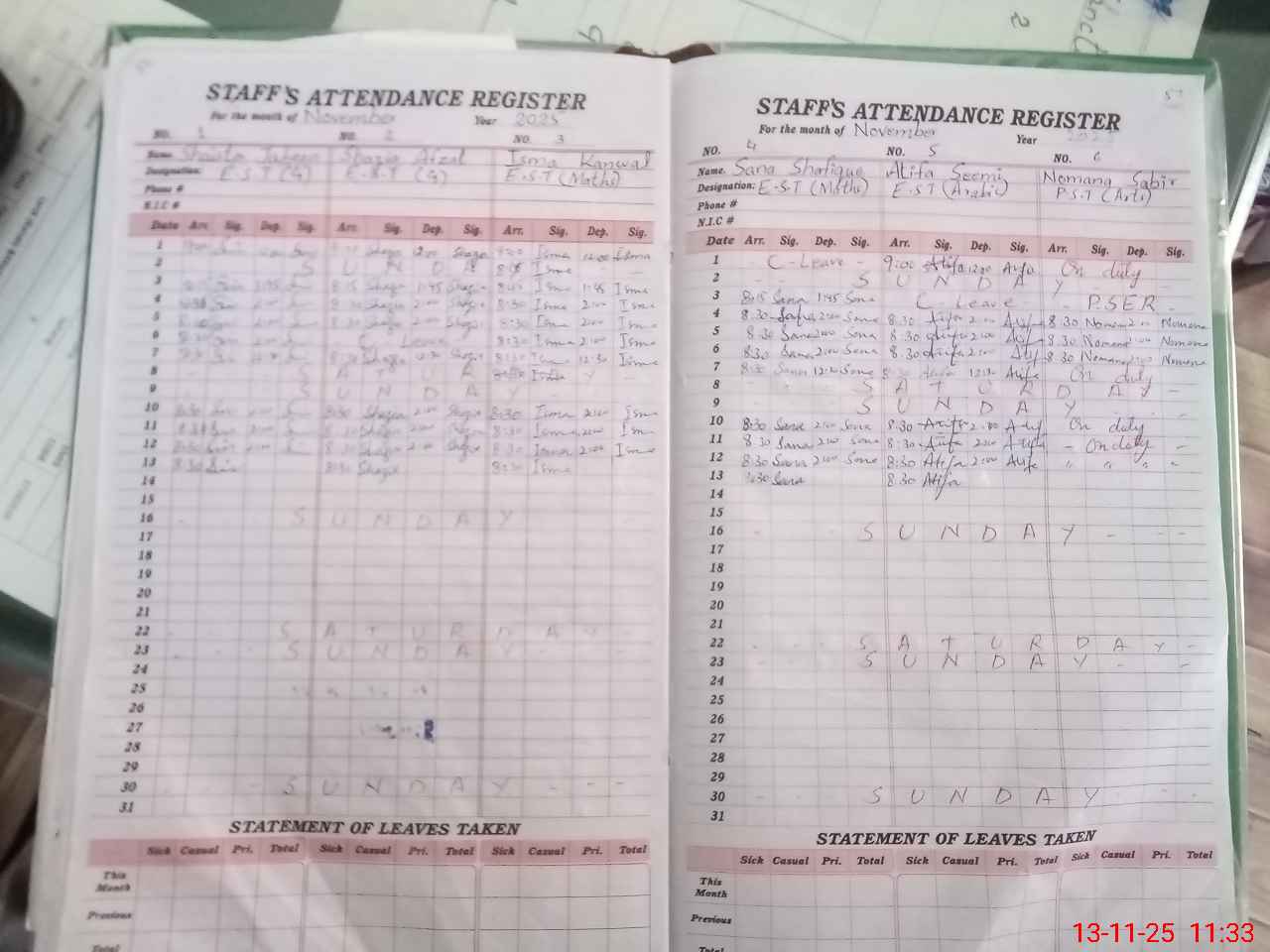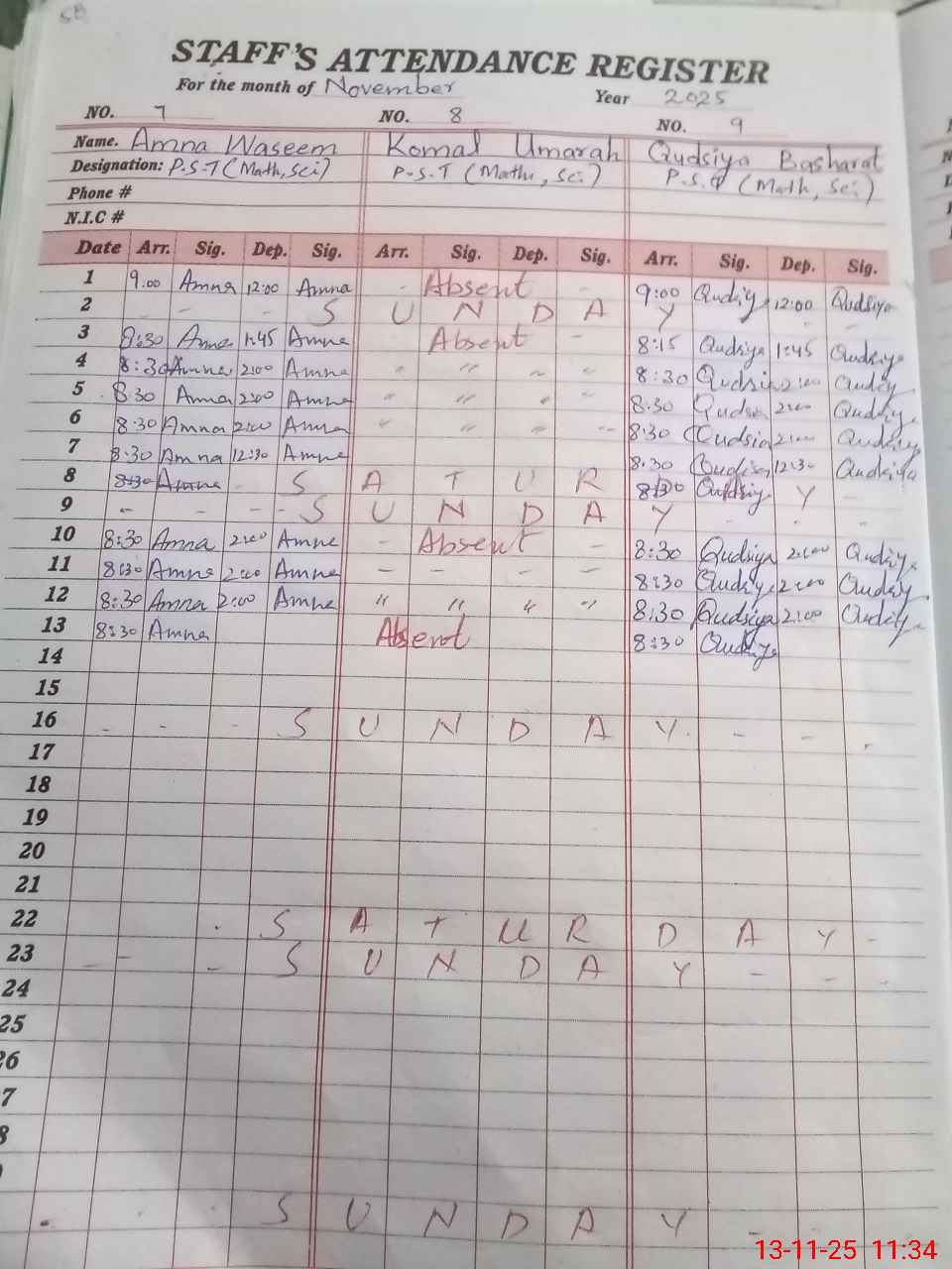 | CNIC | Full Name | Designation | R/C | Absence During Last Calender Month |