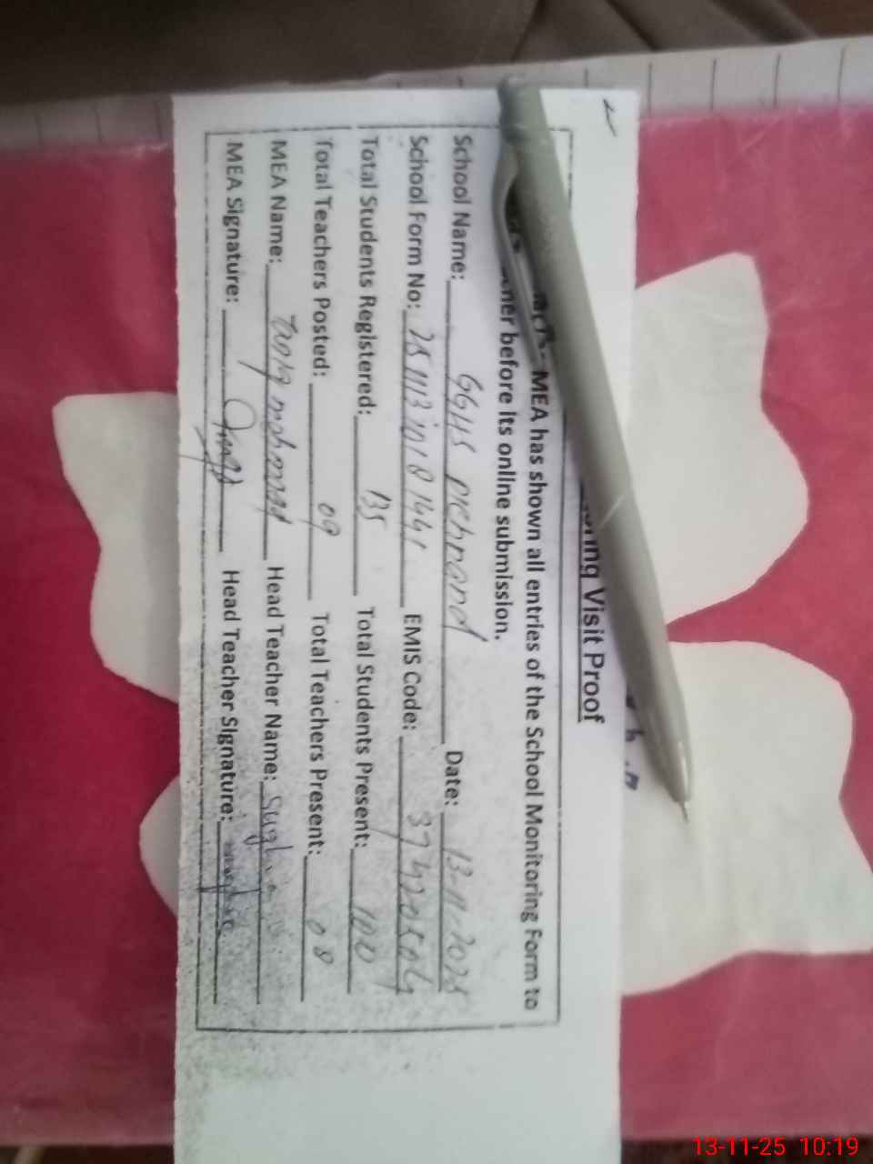| Attendance Register | Head Teacher | MEA with School | Visit Proof |