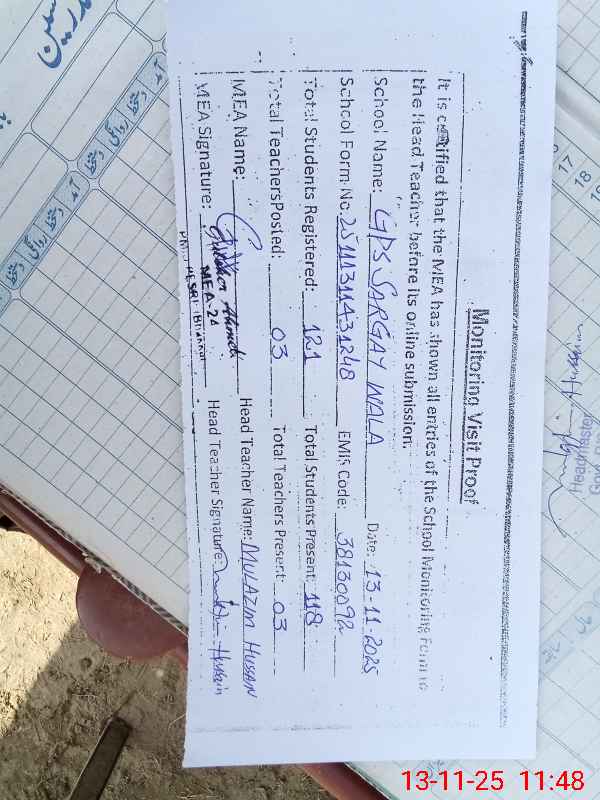 | EMIS Code: 38130092 | Name of School: GPS SARGAY WALA | |||