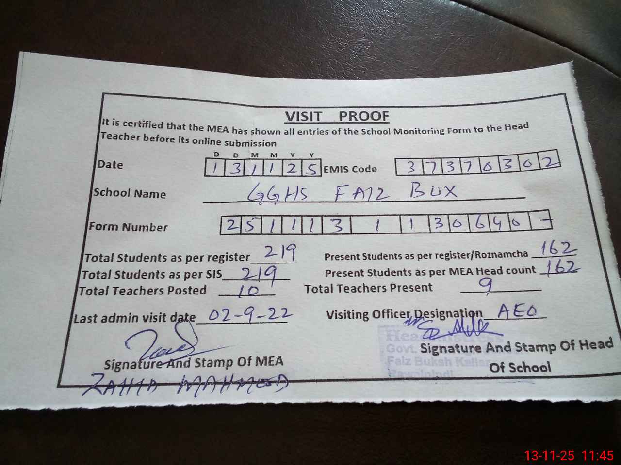 | Attendance Register | Head Teacher | MEA with School | Visit Proof |