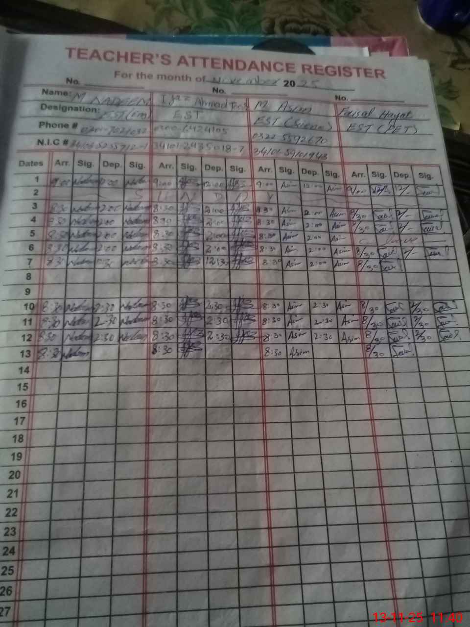 | CNIC | Full Name | Designation | R/C | Absence during last cal. month |