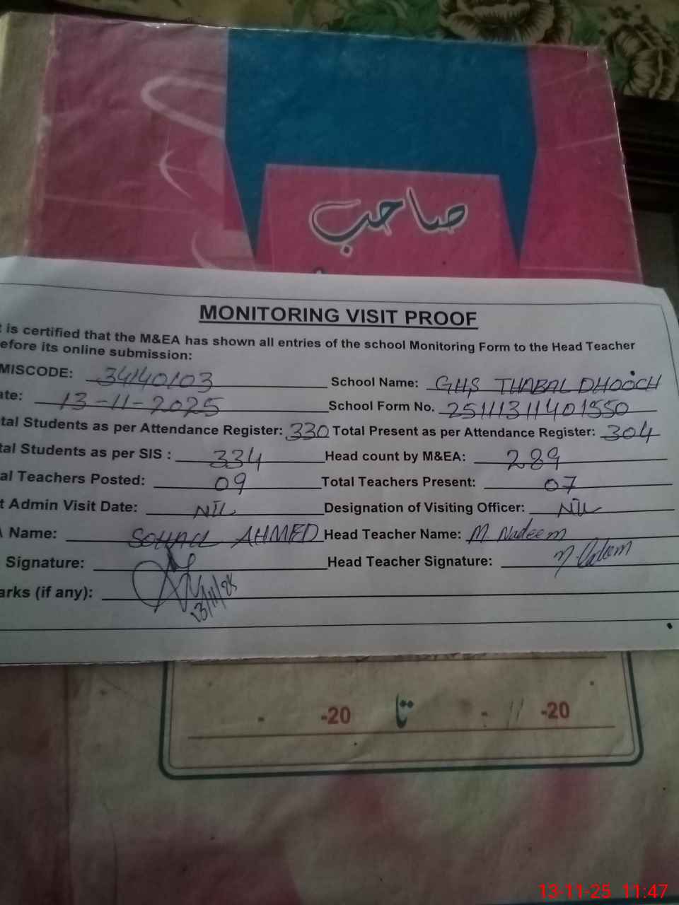 | Attendance Register | Head Teacher | MEA with School | Visit Proof |