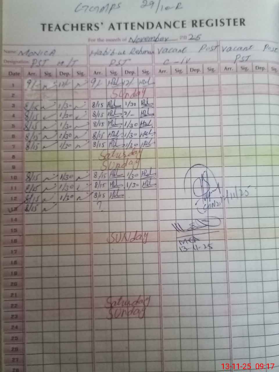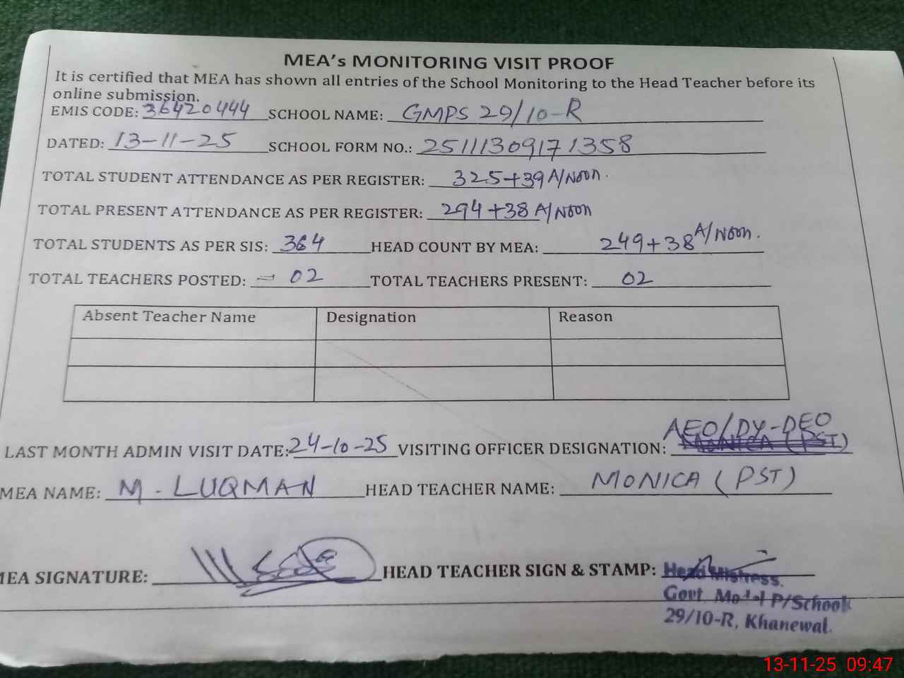 | Attendance Register | Head Teacher | MEA with School | Visit Proof |