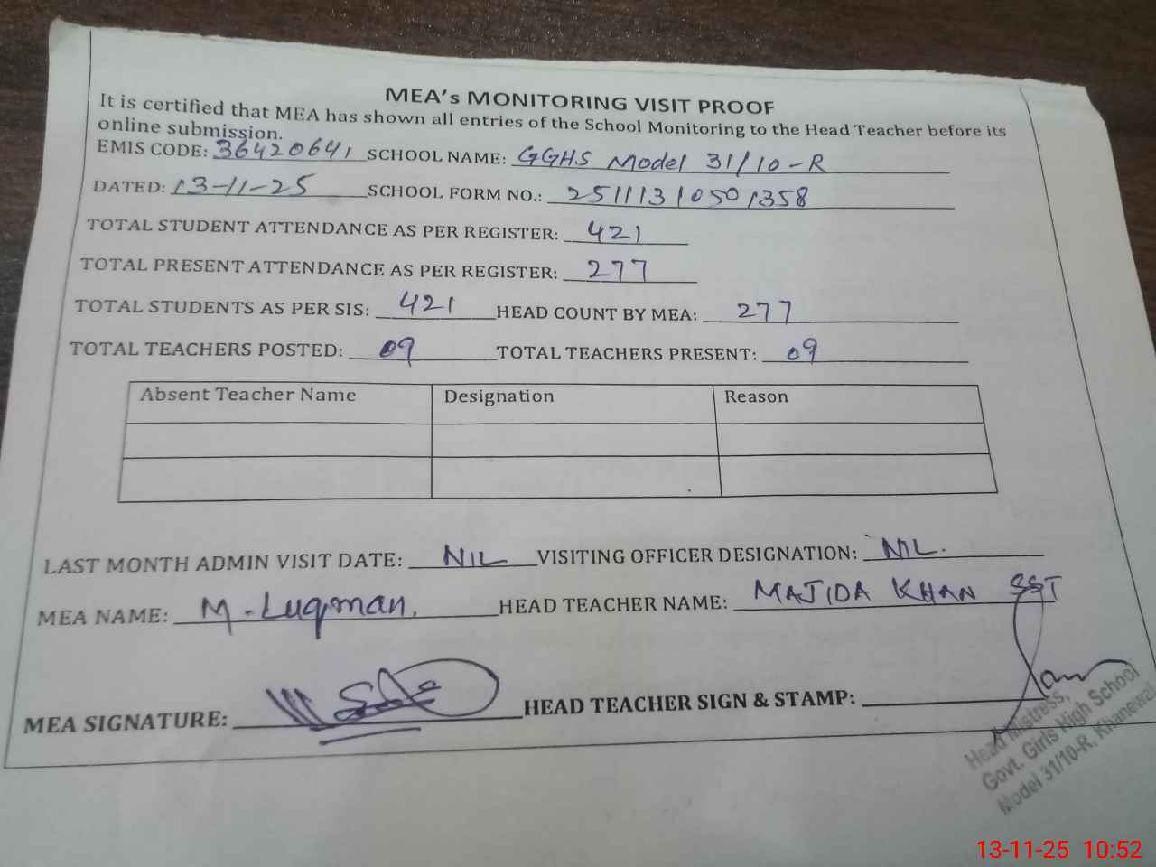| Attendance Register | Head Teacher | MEA with School | Visit Proof |