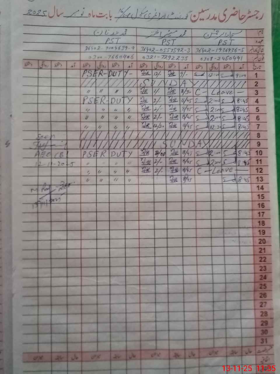 | Name: SA**** URRE**** Designation: (School Headmaster's/Headmistress's) PST Phone/Cell Number: 03**** |