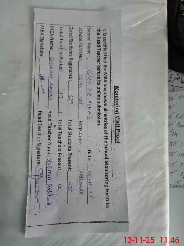 | Monitoring Date: 13-11-2025 | Start Time: 13-11-2025 10:54 AM | End Time: 13-11-2025 11:47 AM | Name of MEA: Gh**** Ak**** Kh**** | |