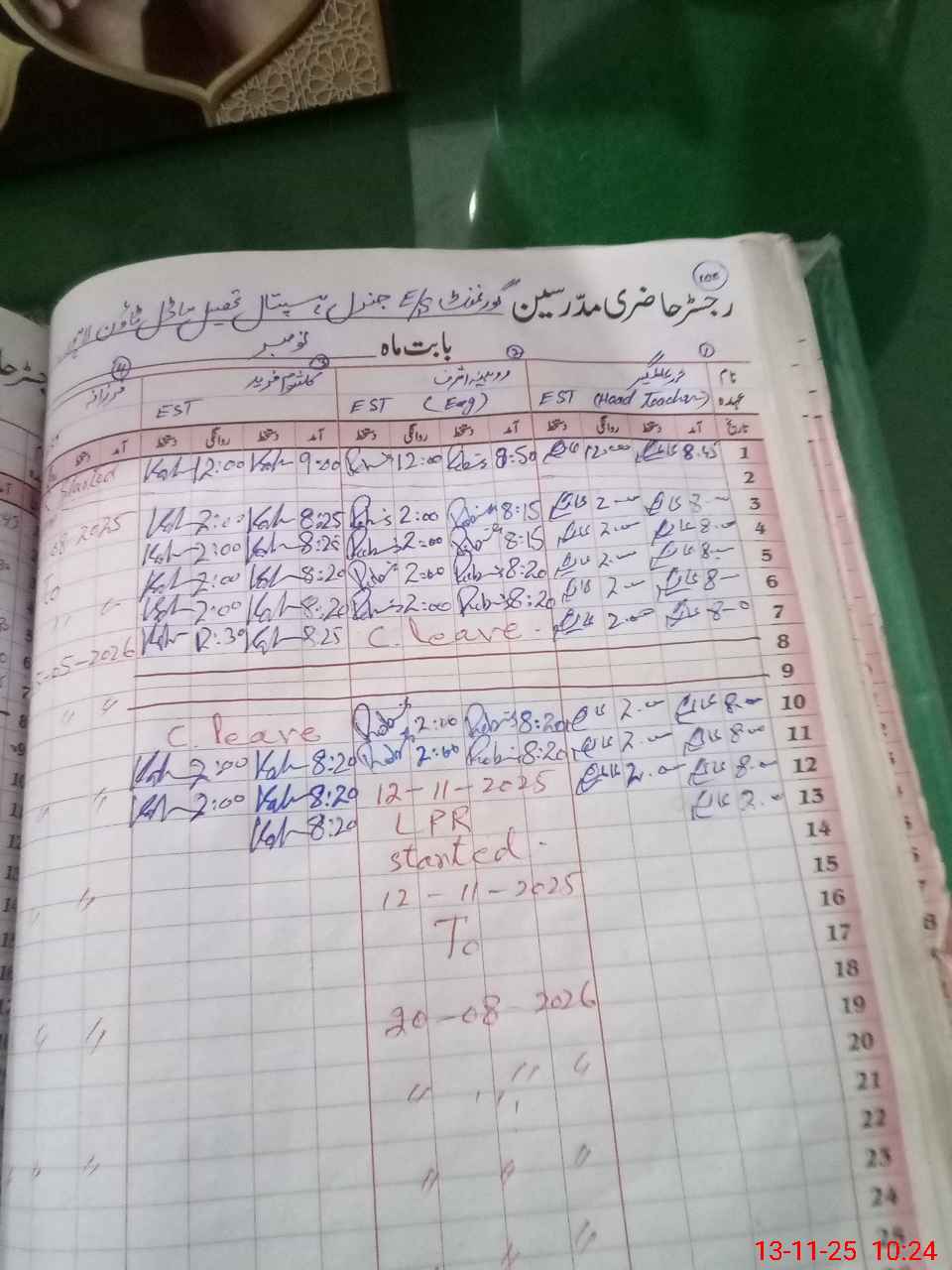 | CNIC | Full Name | Designation | R/C | Absence During Last Calender Month |