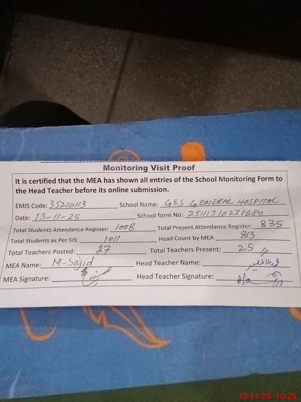 | Attendance Register | Head Teacher | MEA with School | Visit Proof |