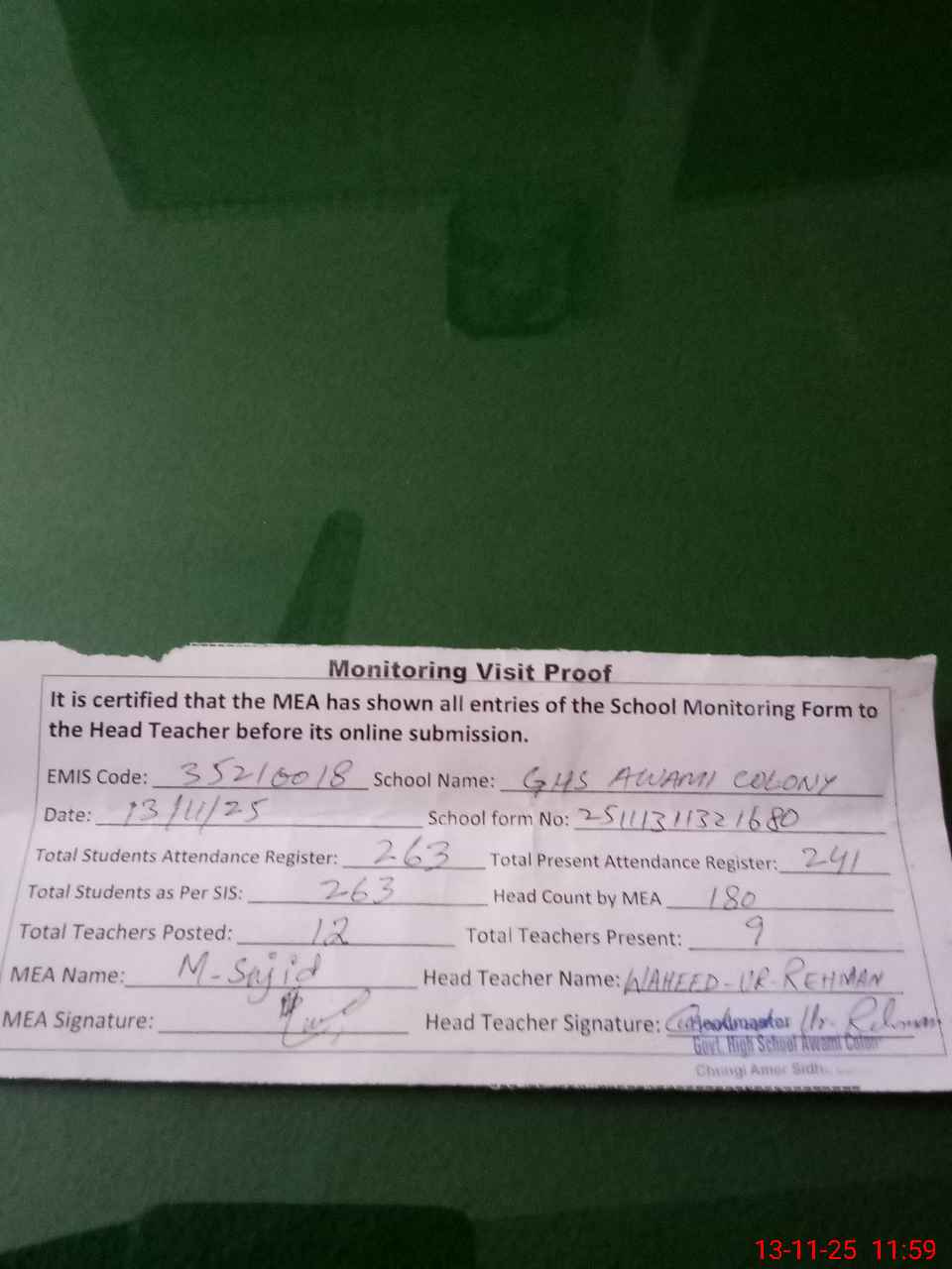 | Attendance Register | Head Teacher | MEA with School | Visit Proof |