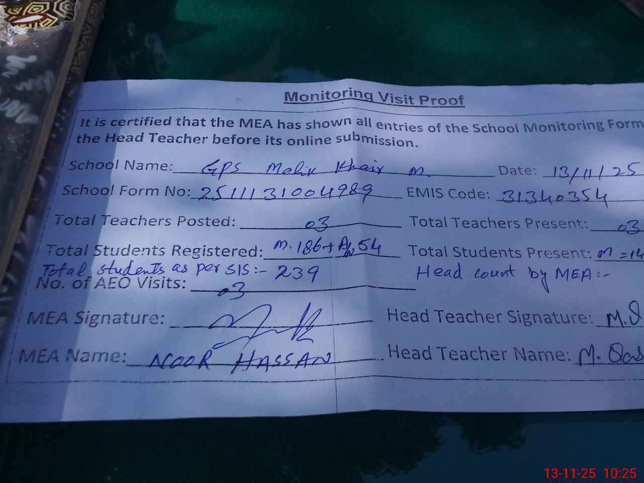 | Attendance Register | Head Teacher | MEA with School | Visit Proof |