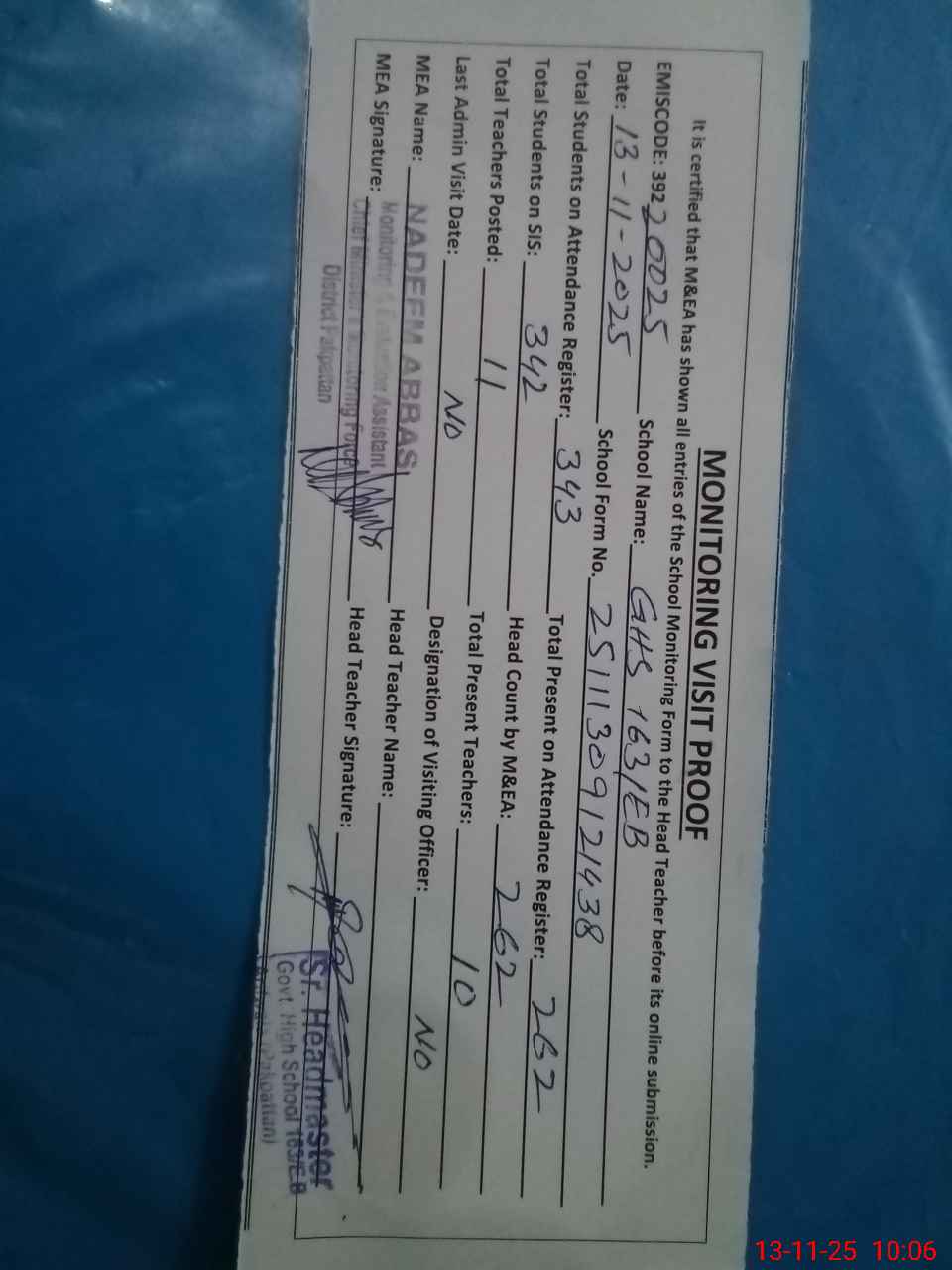 | Attendance Register | Head Teacher | MEA with School | Visit Proof |