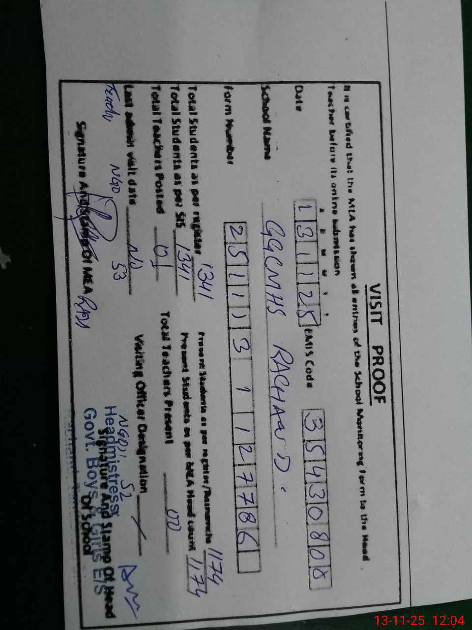 | Attendance Register | Head Teacher | MEA with School | Visit Proof |