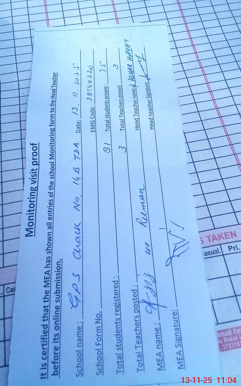 | Attendance Register | Head Teacher | MEA with School | Visit Proof |