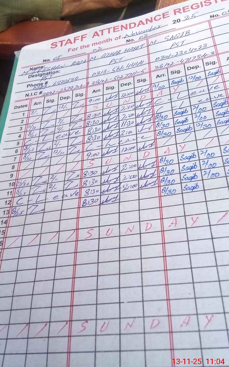 | CNIC | Full Name | Designation | R/C | Absence During Last Calender Month |