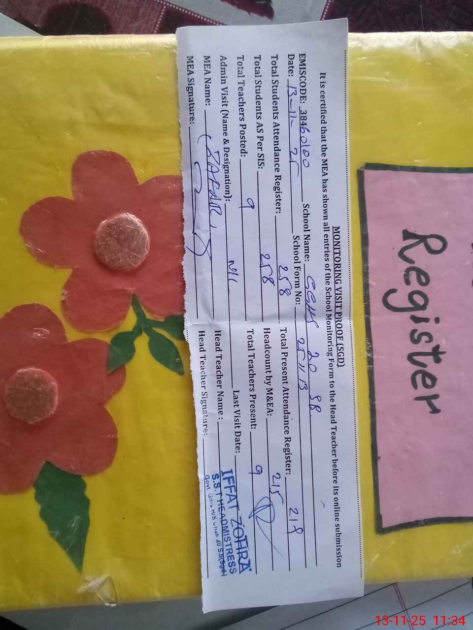 | Attendance Register | Head Teacher | MEA with School | Visit Proof |
