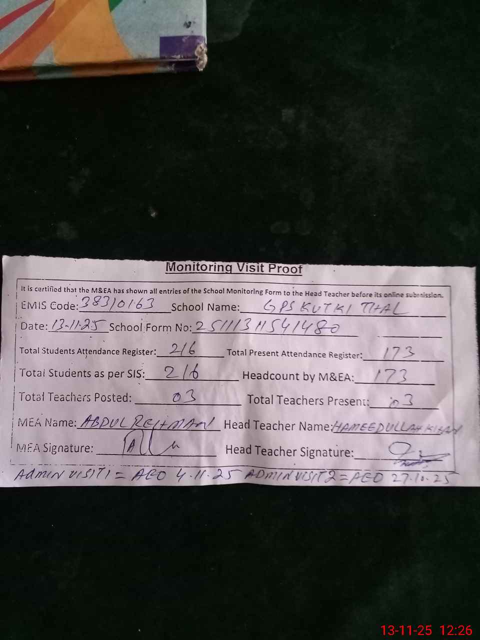| Attendance Register | Head Teacher | MEA with School | Visit Proof |
