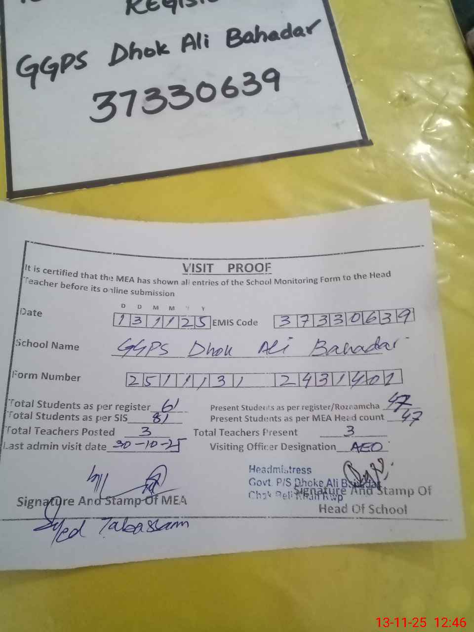 | Attendance Register | Head Teacher | MEA with School | Visit Proof |