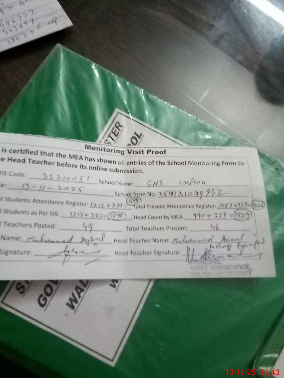 | Attendance Register | Head Teacher | MEA with School | Visit Proof |