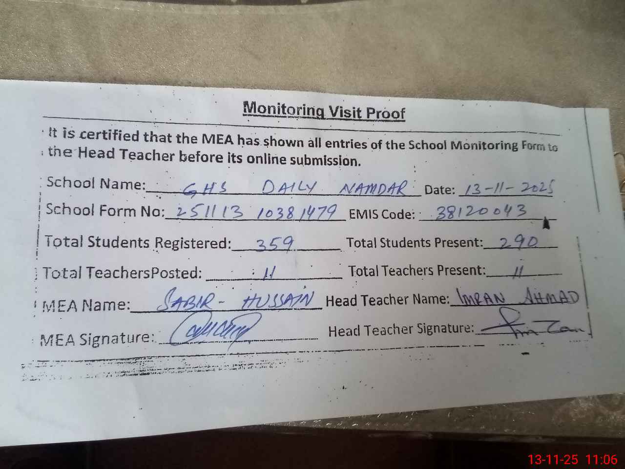 | EMIS Code: 38120043 | Name of School: GHS DAILY NAMDAR | |||