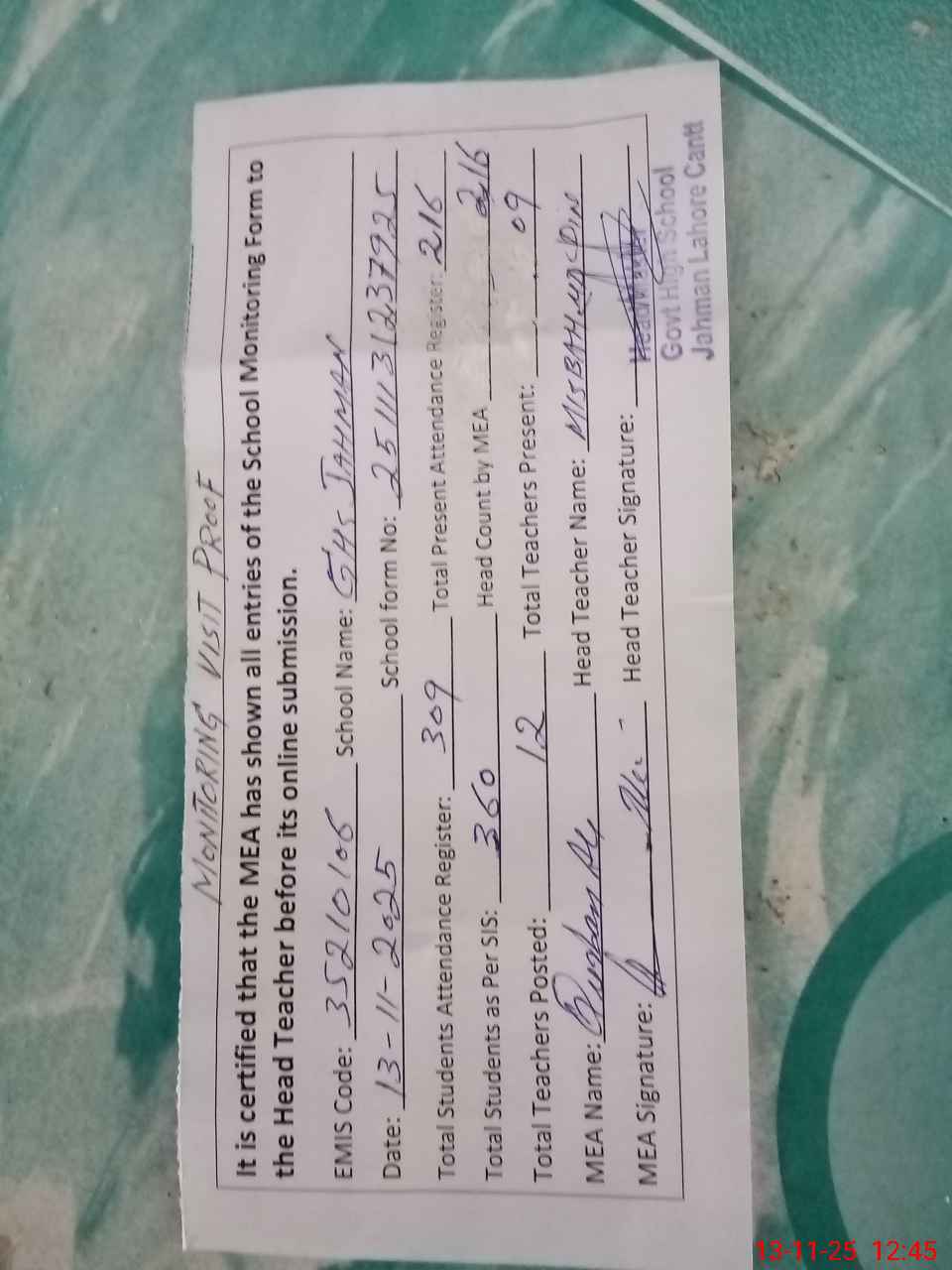 | Attendance Register | Head Teacher | MEA with School | Visit Proof |