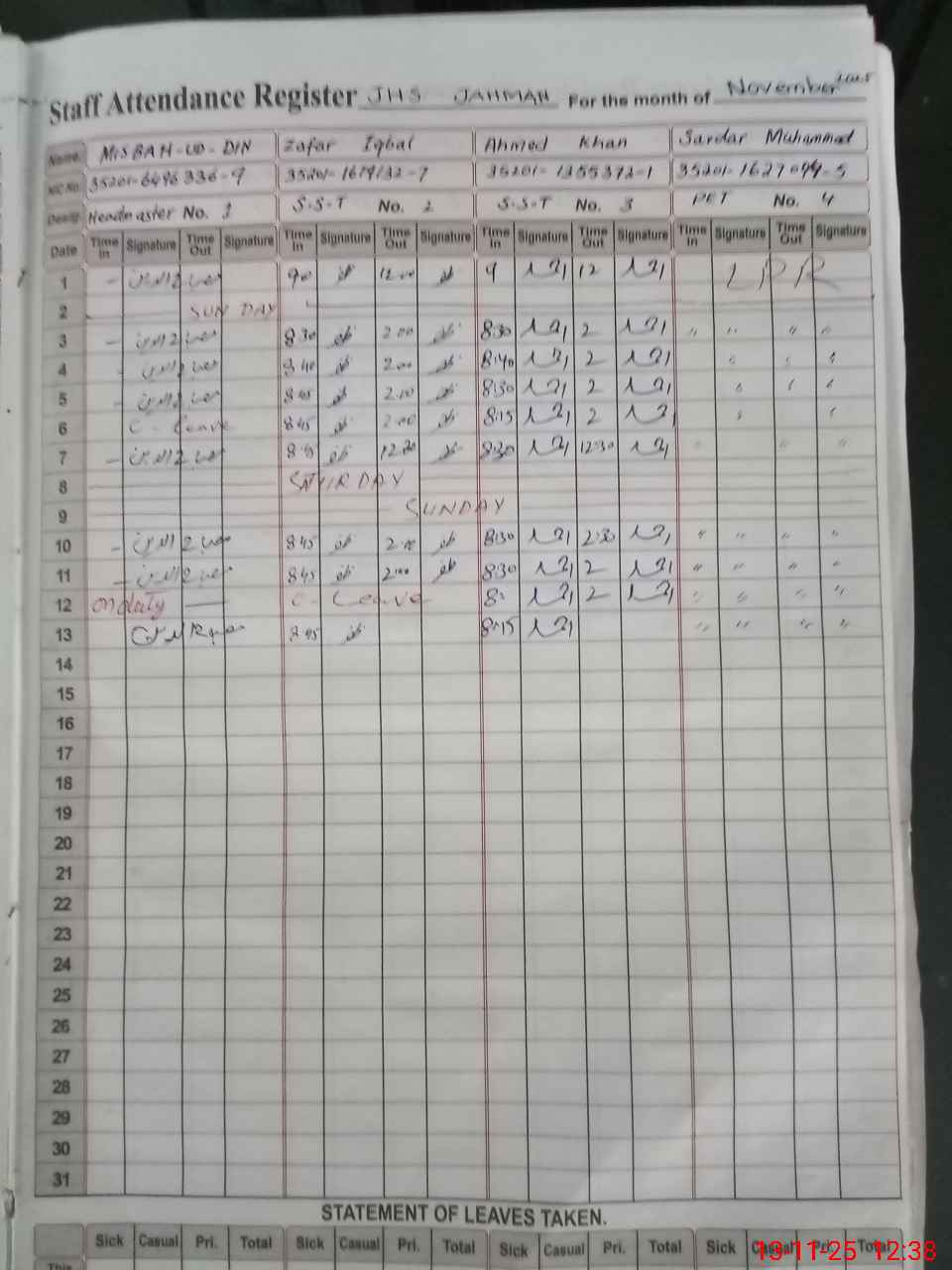 | CNIC | Full Name | Designation | R/C | Absence During Last Calender Month |