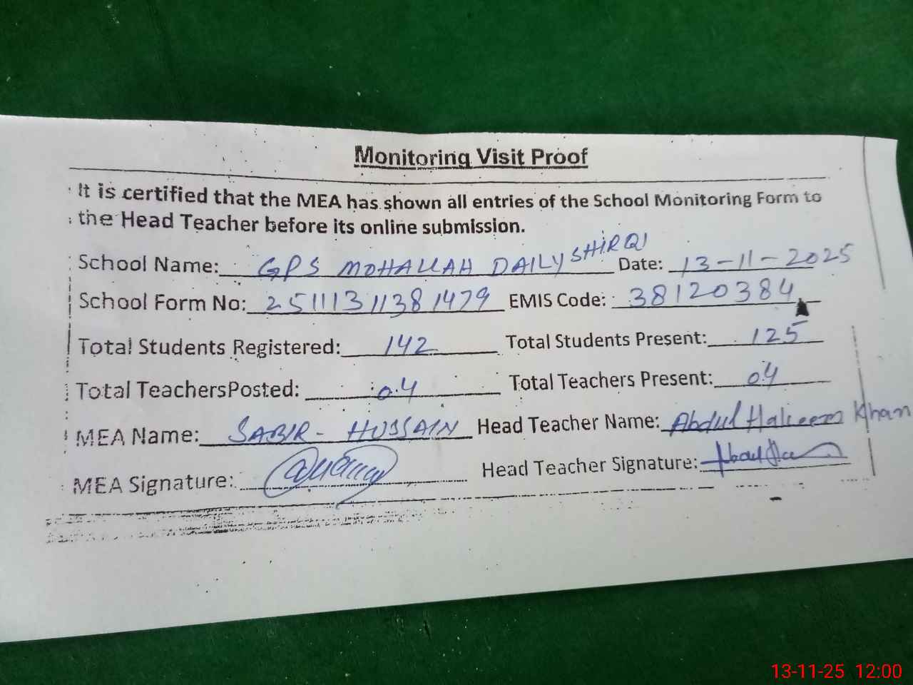 | Attendance Register | Head Teacher | MEA with School | Visit Proof |