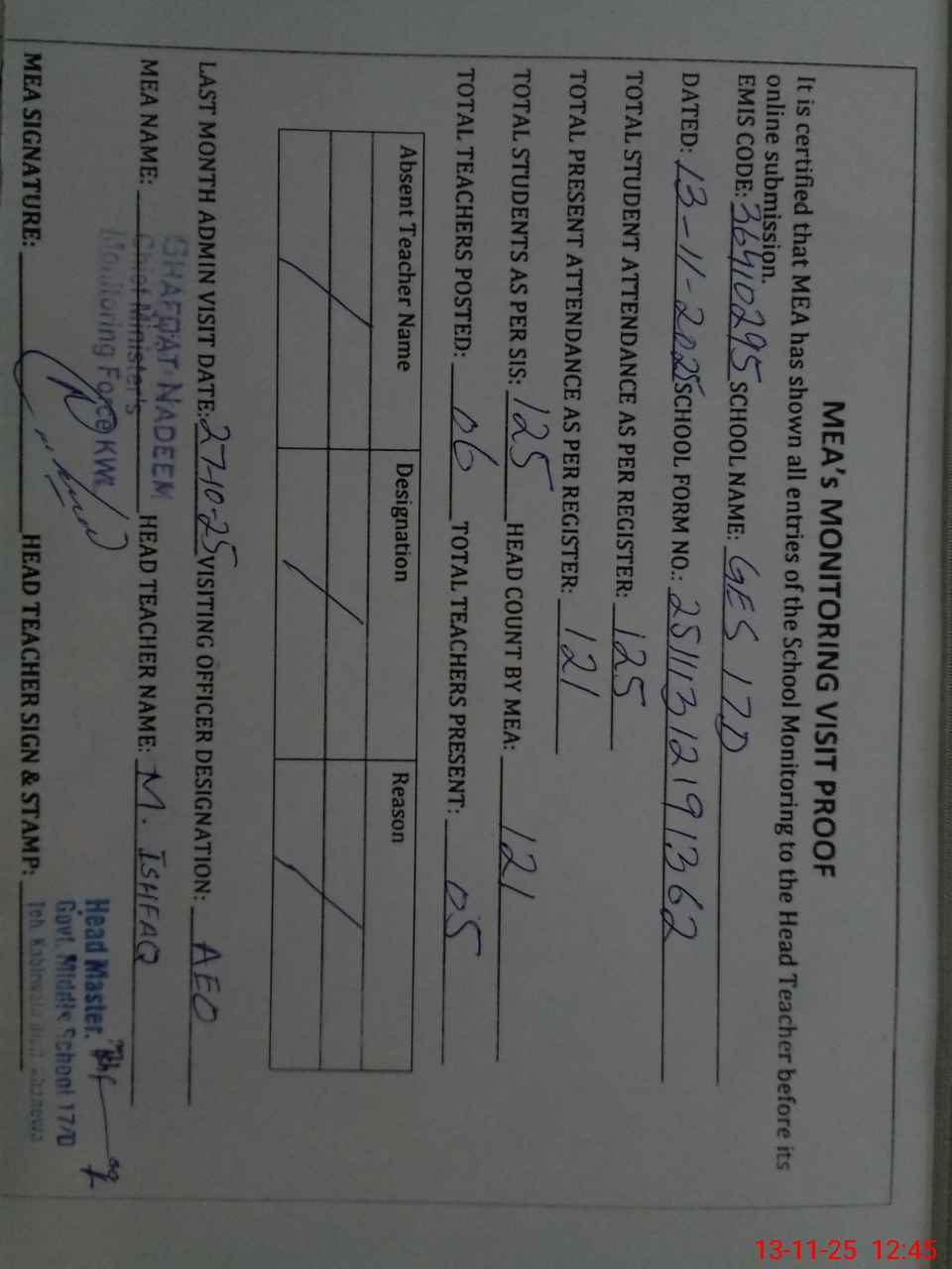 | Attendance Register | Head Teacher | MEA with School | Visit Proof |