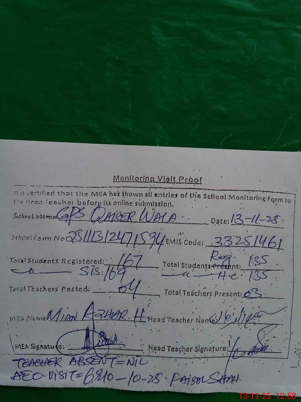 | EMIS Code: 33251461 | Name of School: GPS QAISER WALA (Newly Establlished) | |||