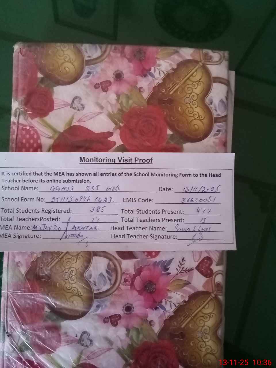 | Attendance Register | Head Teacher | MEA with School | Visit Proof |