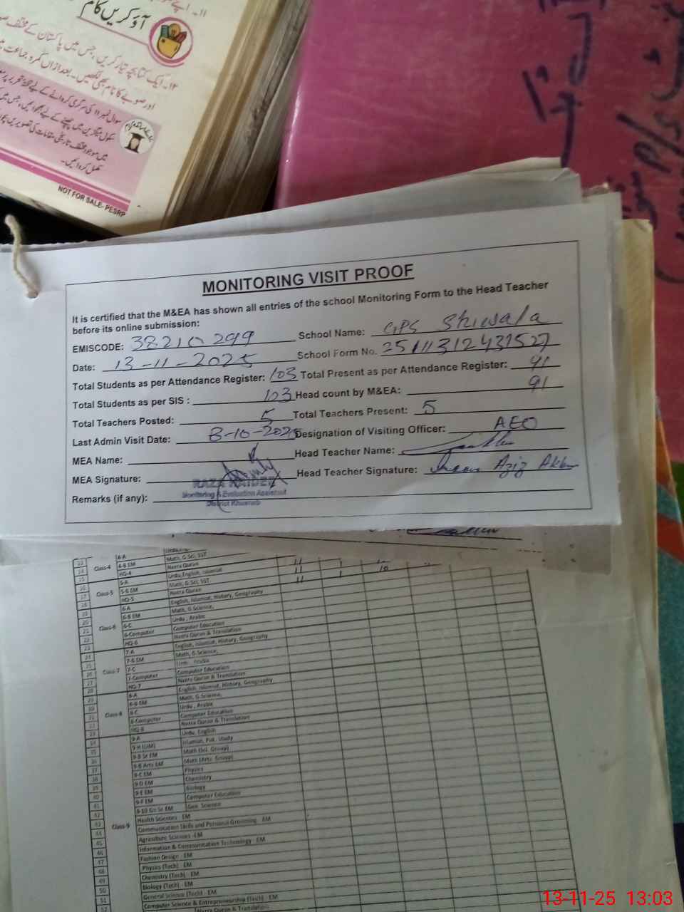 | Attendance Register | Head Teacher | MEA with School | Visit Proof |