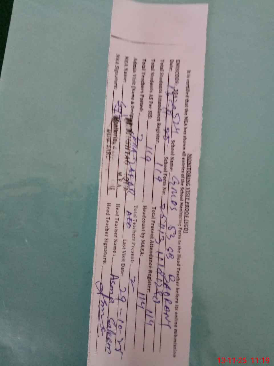 | Attendance Register | Head Teacher | MEA with School | Visit Proof |