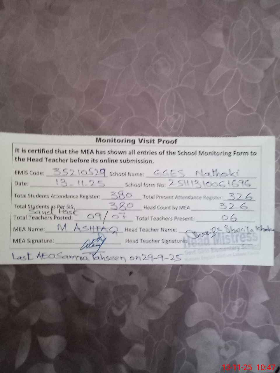 | Remarks (Use Separate Page if Required): Deputy DEO Cantt Javeeria visited on 21 October 25 No AEO visit in October 25 Last visit of AEO Samra Tehseen on 29 September 25 Teachers Sanctioned Post 09 Filled 07 35210529 | |||||
