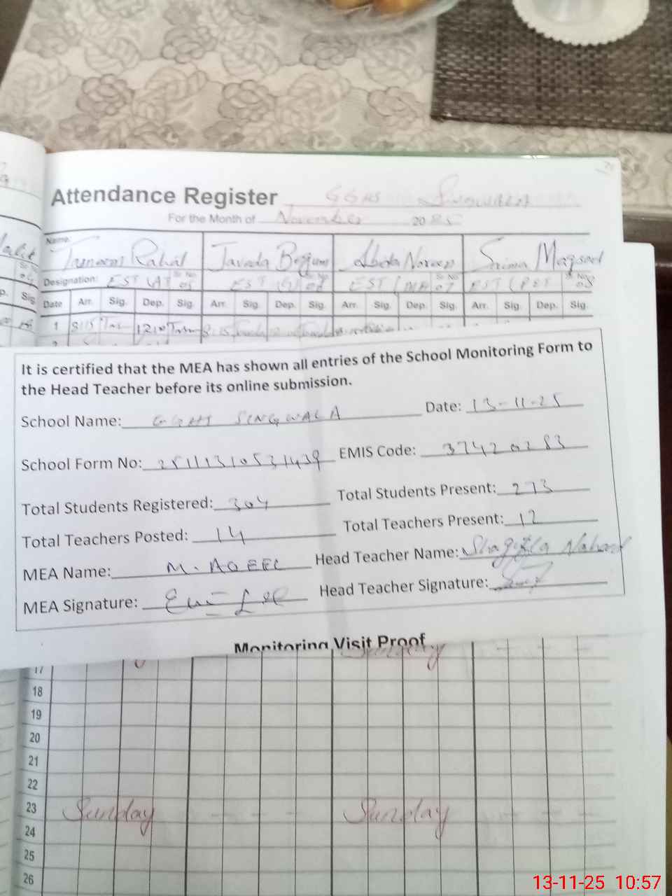 | Attendance Register | Head Teacher | MEA with School | Visit Proof |