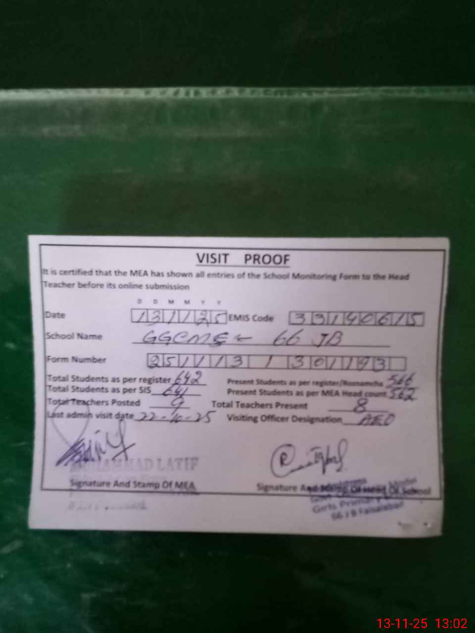 | Attendance Register | Head Teacher | MEA with School | Visit Proof |