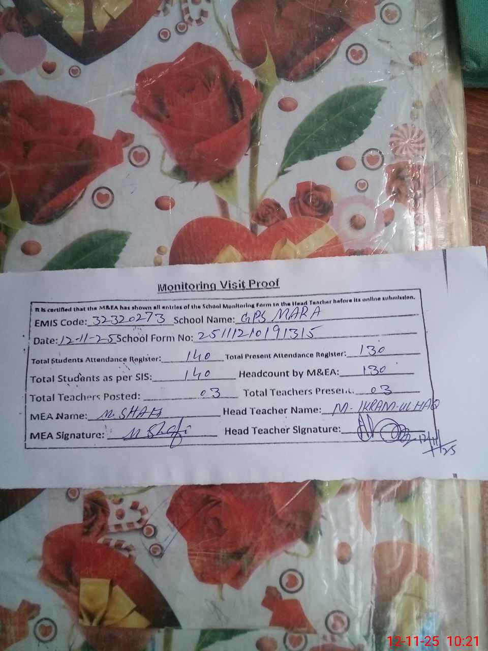 | Attendance Register | Head Teacher | MEA with School | Visit Proof |