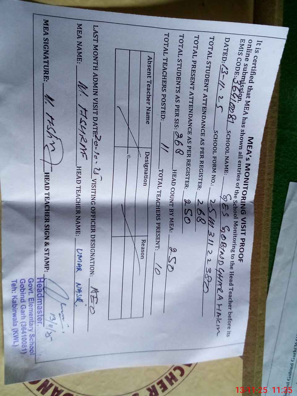 | Attendance Register | Head Teacher | MEA with School | Visit Proof |