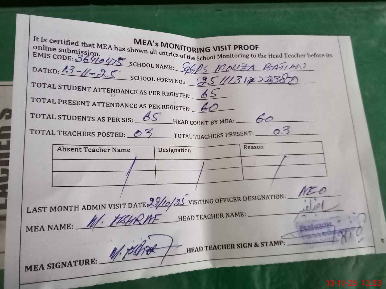 | Attendance Register | Head Teacher | MEA with School | Visit Proof |