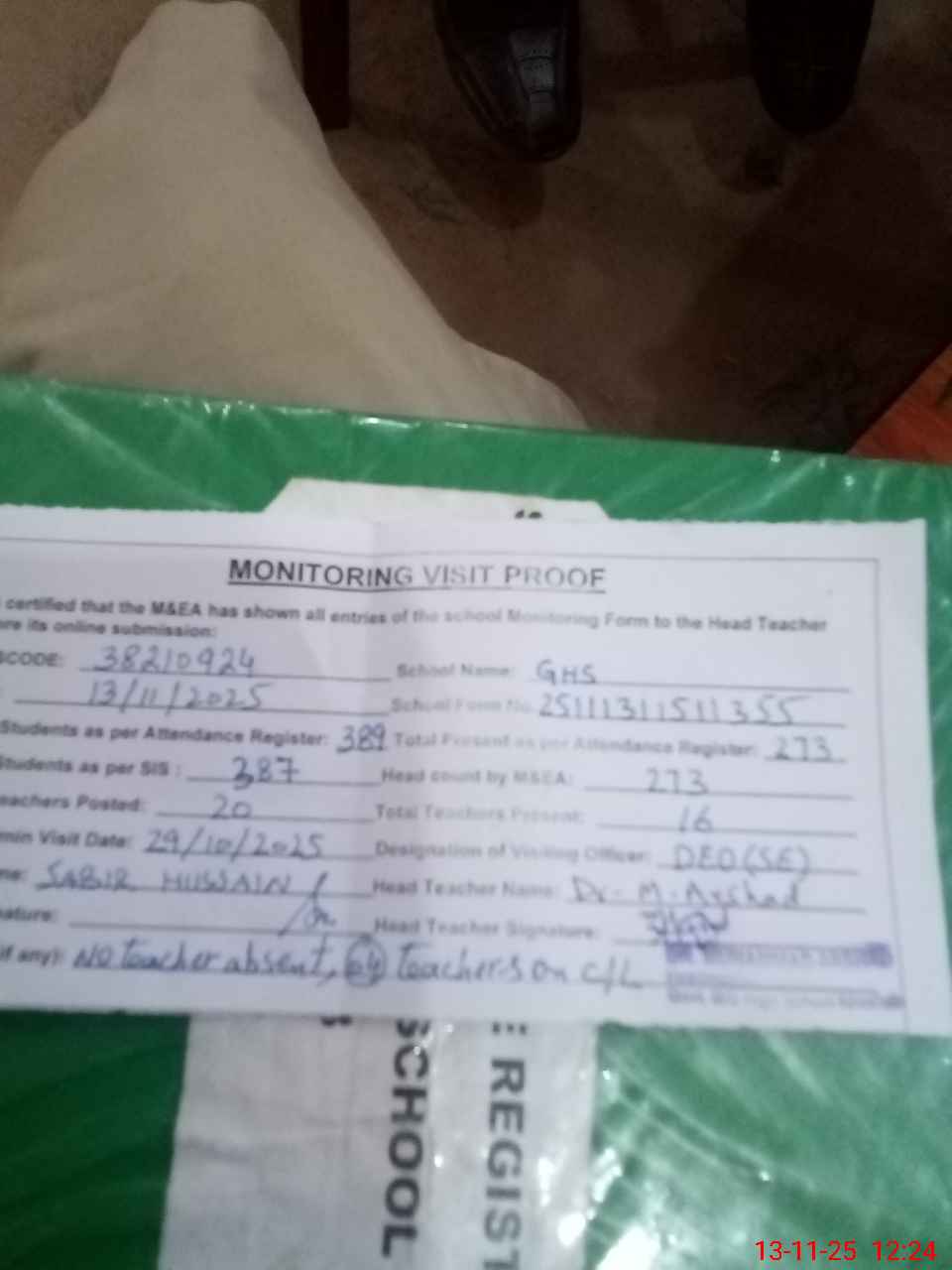 | Remarks (Use Separate Page if Required): No teacher absent 04 teacher on casual leave Last admin visit by DEO SE on 29 Oct 2025 | |||||