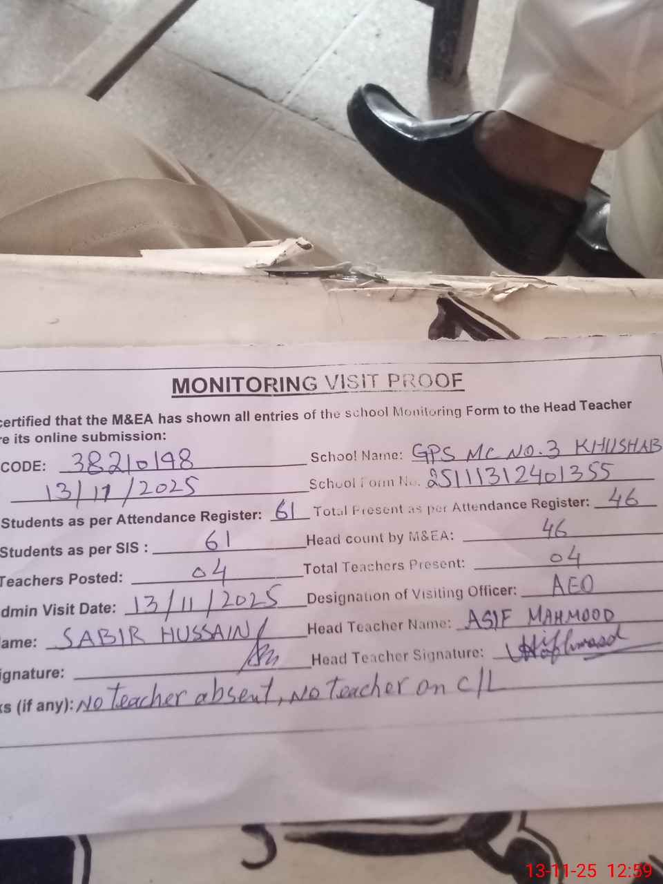 | Remarks (Use Separate Page if Required): No teacher absent No teacher on leave Last admin visit by AEO on 13 Nov 2025 | |||||