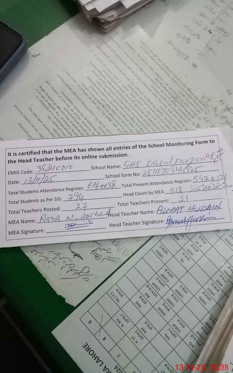 | Remarks (Use Separate Page if Required): Head teacher Agha Ibne Saud Sb on Casual leave as per attendance register but his sanctioned casual leave was not available on line so according to monitoring sop mark him Absent School management immediately write on attendance register for casual leave in front of head teacher name NQ Naveed Elahi Absent from duty wef 8 November to date Students attendance 76 percent as per head count 35 students difference found after head count Class 6b and Class 8a students furniture not appropriate for sitting Code 35210010 | |||||