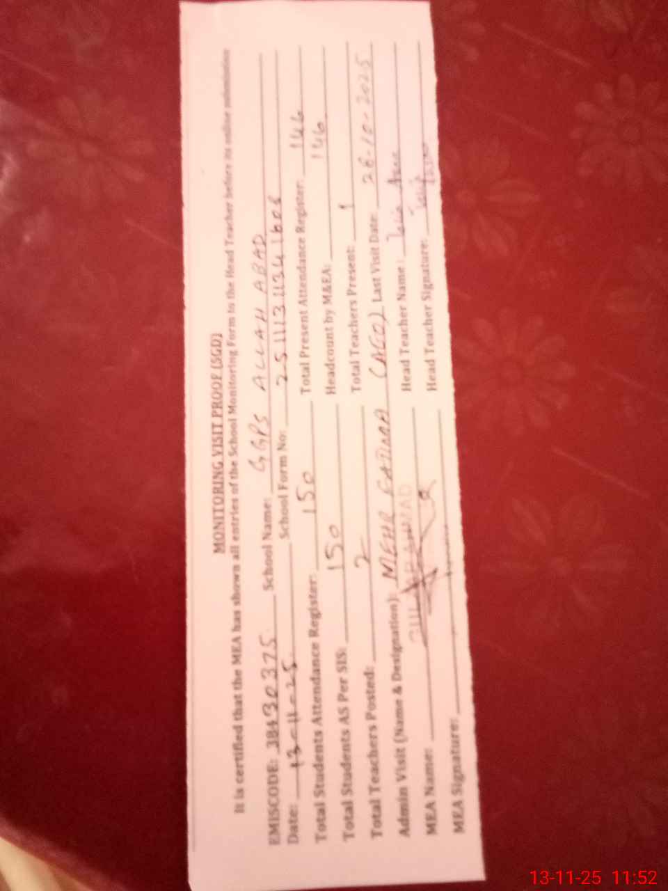 | Attendance Register | Head Teacher | MEA with School | Visit Proof |
