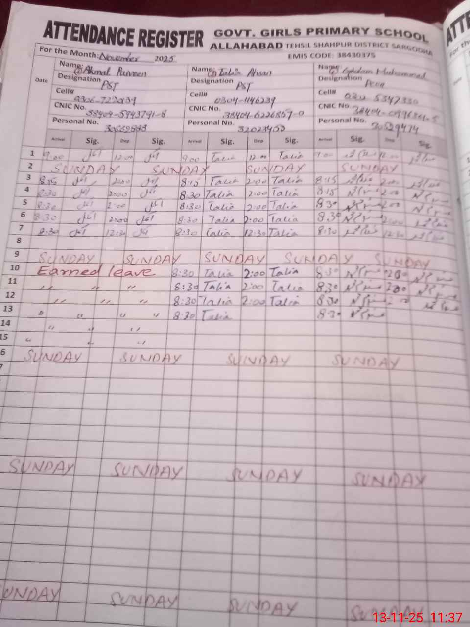 | CNIC | Full Name | Designation | R/C | Absence During Last Calender Month |