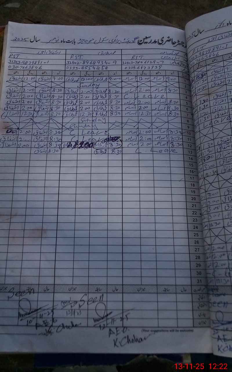 | CNIC | Full Name | Designation | R/C | Absence During Last Calender Month |