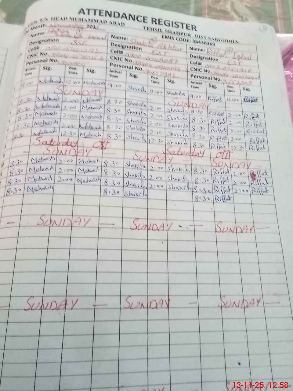 | CNIC | Full Name | Designation | R/C | Absence During Last Calender Month |