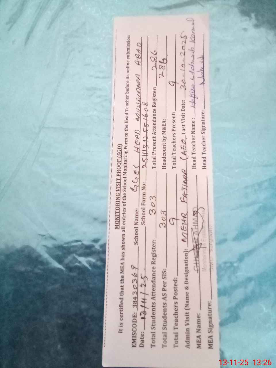 | Attendance Register | Head Teacher | MEA with School | Visit Proof |