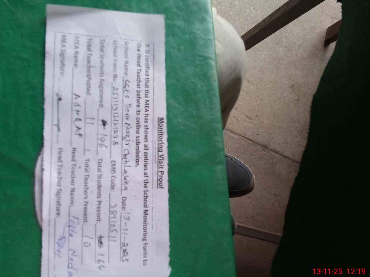 | Attendance Register | Head Teacher | MEA with School | Visit Proof |